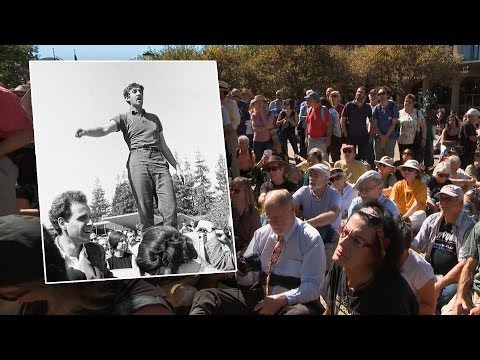 SPENCER MICHELS (NewsHour): The sounds of a familiar past blared over Sproul Plaza on the campus of the University of California at Berkeley. The voice, from 1964 was that of the late Mario Savio, the most famous leader of the free speech movement, the first big on-campus student movement in the country.